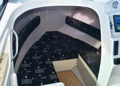 really like the clean lines of the SP560 which exemplifies that this boat design follows the age-old principle that form follows function. Everything looks well thought out and integrated. From the helm station sun shield tower to the transom tower/roll bar, which houses the stern navigation lights as well incorporating large, sturdy grab handles to ease getting in and out of the boat, to the uniquely patterned, non-slip deck tread and to simple things like the little cushioned back rest in the bow – it all works.