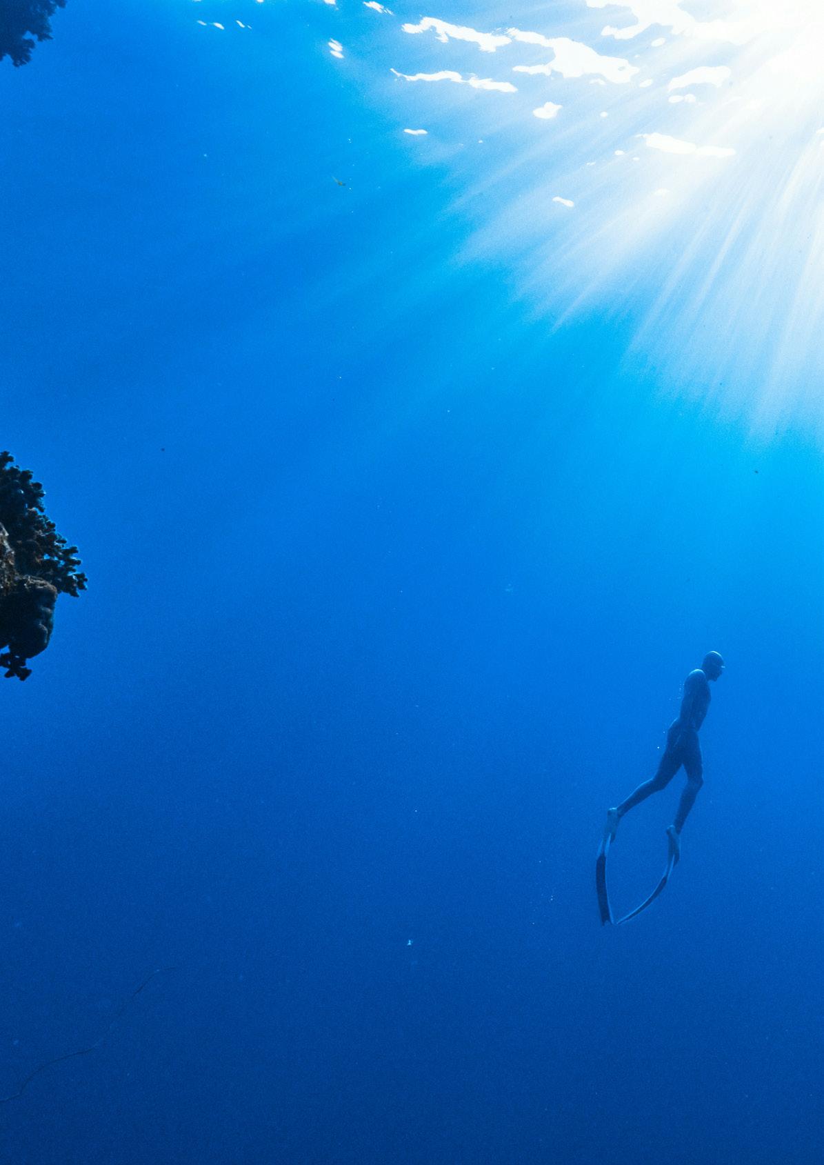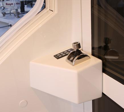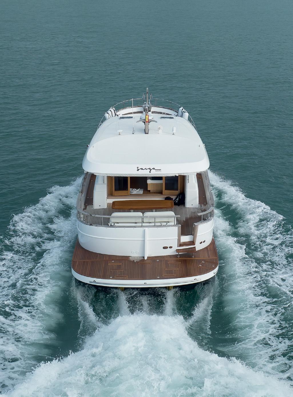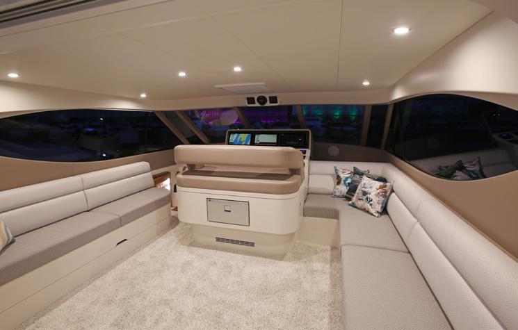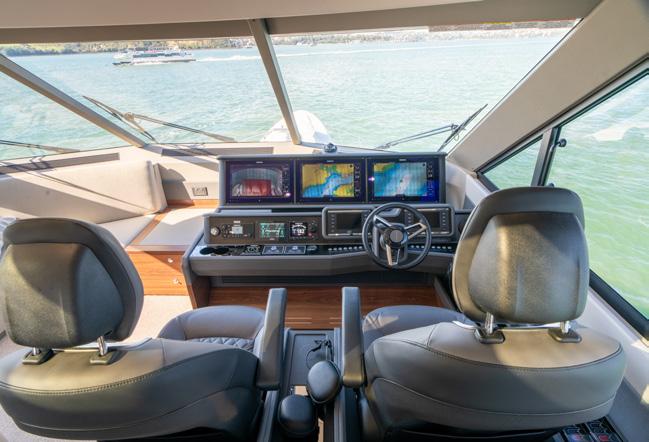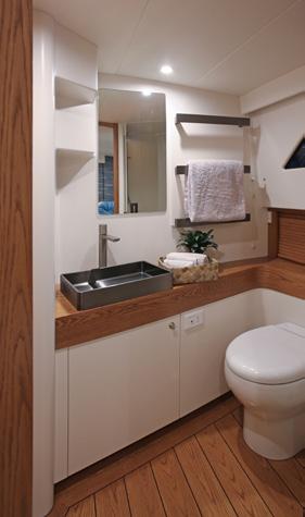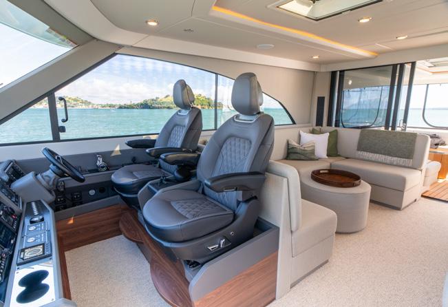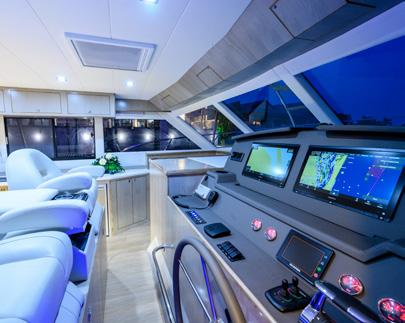 side of the wheelhouse for when the weather gets a little sporty to prevent water ingress. The station overlooks a couple of sunbeds forward as well as the deck carved in a couple of deep paths with hip-high rails to keep you safe. These economies of forward deck space and different deck heights produce a huge amount of extra storage. Back in the pilothouse, there is also a day head and a corner lounge and table and the walkways around the pilothouse and the visibility to the waterline and from stem to stern is astounding. The vessel can be parked with a simple walk around wireless remote Yacht Controller instead of a joystick. Solid buttons to go ahead and astern, port or starboard, as well as bow and stern sliding buttons are a breath of fresh air. In terms of getting my head around new technical systems and procedures I am not much chop and a bit of a traditionalist. I even struggle with my Netflix setup. But this craft’s manoeuvring systems are beautifully simple and uncomplicated with traditional propellers over rudders and thrusters either end. It can be shoehorned into the tightest spots around the marina or even into a coral bombie field for a dive.