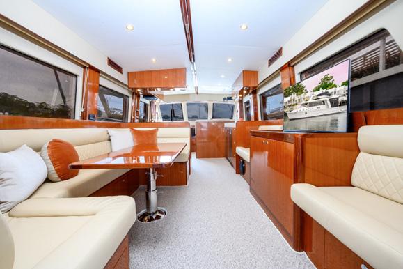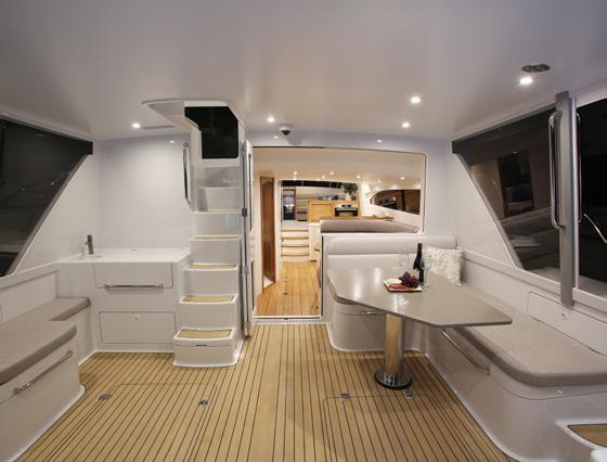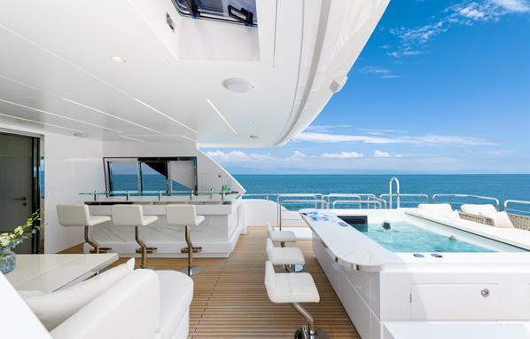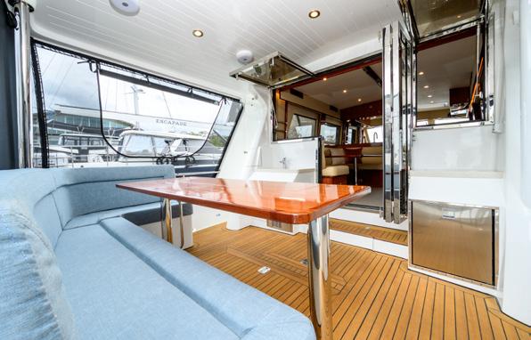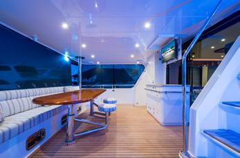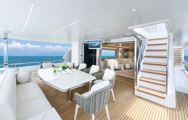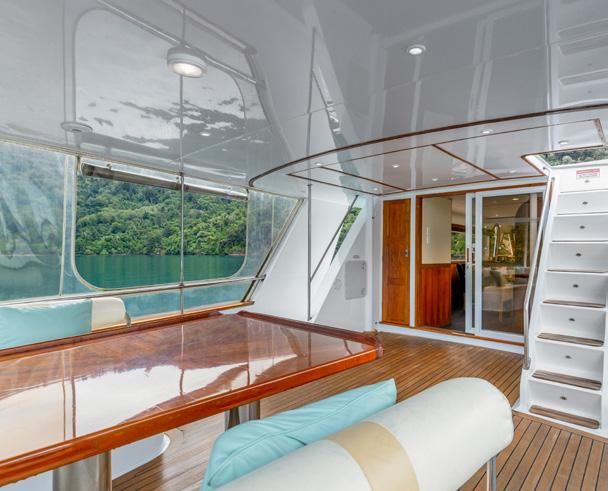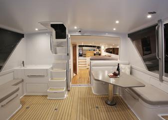 style accommodation, and with just a few steps from the waterline, it’s all one level. Starting with the cockpit, it’s huge with a large dining table for 10 and walk around side decks as well as a wet bar, the first of two teppanyaki barbeques and a dropdown TV - and we haven’t stepped inside yet. The walk around deck that leads forward can be shutdown with wind doors that, when underway or at anchor, stop your guests getting blown about. And then it’s through
