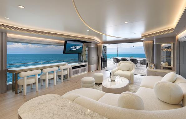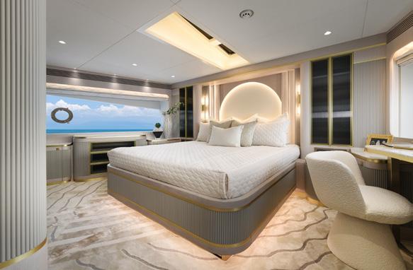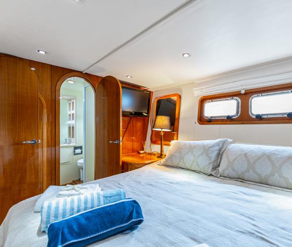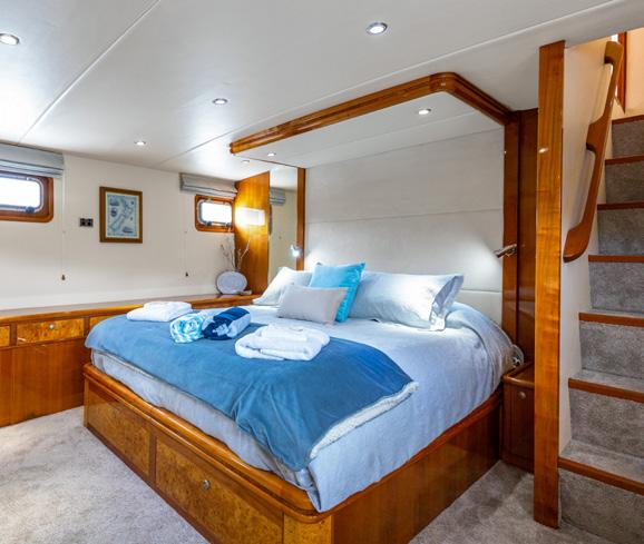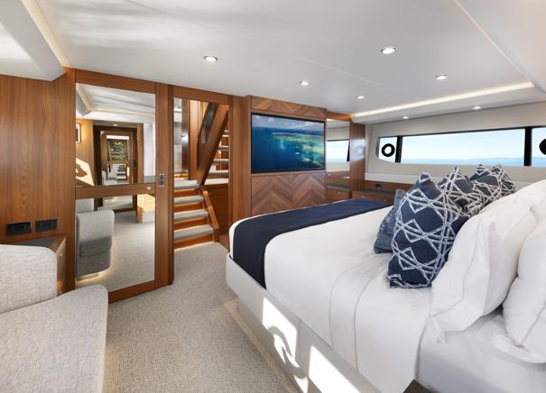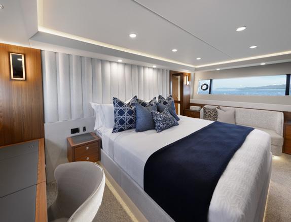 saloon opposite the stairs to the crew quarters. Who knew? The saloon and galley area combined is direct from the pages of an upmarket designer magazine, with huge full height windows that run the length of the saloon. The curves in the ceiling, with camouflaged lights which match the floor and carve out spaces, turn a mammoth cavernous arena into a chic and wellproportioned apartment. There are water views from every vantage point, bringing the outdoors in, and televisions and electric blinds melt seamlessly away out of sight into the ceilings and cabinetry. A sturdy glass door either side of the saloon, combined with opening the aft doors, creates plenty of cross breeze combinations for any situation. Further forward, past the galley and just before the owner’s suite on the starboard side, is a set of clandestine stairs. The timber treads seemingly float in the air using a glass wall and some pretty ingenious construction. They lead aft and up to the bridge and down to the other three passenger cabins.