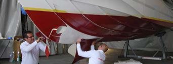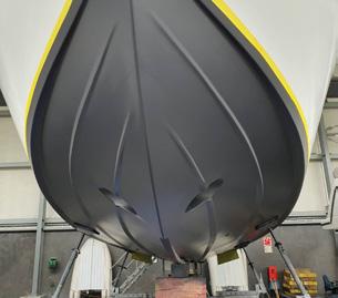 adhesive film. The principle is based on the low surface tension and smooth finish of the upper layer in contact with the water, reducing considerably any loss of momentum. The combination of adhesive film and silicon layer provide a biocidefree antifouling solution. The antifouling function lasts for the entire maintenance period for the upper layer. The boat begins to clean itself (at a speed of 8 knots) and is easy to clean by hand when the boat is not moving using a soft brush, sponge, window squeegee or soft glove. The advantage of the adhesive film is that it is easy to replace any part of it that is damaged (in the form of a patch available separately).