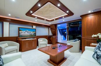 the full width and height doors that slide away to reveal a designer-influenced cavernous space that seamlessly flows all the way forward past the galley to the owner’s suite.