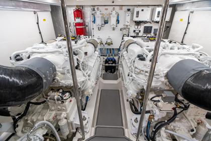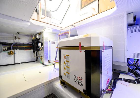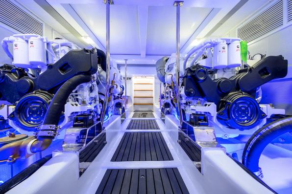 Engine room- We finish the tour with another surprise. Once we find our way down through the steps at the rear of the saloon we emerge and turn towards the bow into the very roomy engine room, certainly an engineer’s dream, and a tall one with big shoulders at that. Housing an array of long-range water makers and black and grey water systems, all comfortable and accessible to work on, we find the elephants in the room. The twin MTU 10V2000 1,600hp mains and twin Onan 27kW. The machinery space is kept cool by the massive overhead twin breathers sucking the hot air away from the space. The ‘simple is best’ layout in the workspaces of the engine room and bridge are uncomplicated and it wouldn’t surprise me if they were designed or replicated from the same merchant navy workrooms as they are well laid out, ordered and extremely functional.