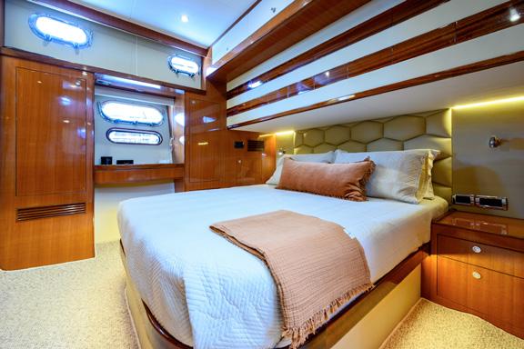 Owner’s suite - From there we head into the owner’s suite. With its massive skylight above the bed and extensive fore-to-aft windows it is a deceptively sizable space and more than adequate digs for the most discerning owner. The cabinetry and more hidden compartments make this sanctuary extensive in terms of closet space, personal office configuration and a huge amount of repository spots for everything you need on an extended trip. This forward cabin arrangement