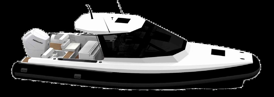 Built to accommodate the 600HP Mercury outboard, this is a one of a kind RIB. Overall length is 9.56m, with an inflated beam of 3.57m and a displacement of 3.1 tonne. Top speed with a single 600hp Mercury is around 45 knots. Like the Custom 800, the deep plumb bow, 23 deg hull is designed by Edoardo Anastasia and JP RIBS.