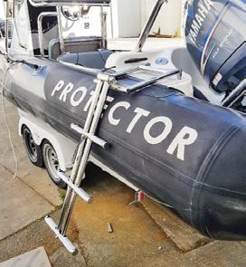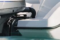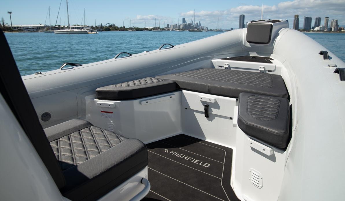 The aft deck features a pair of storage lockers and a robust powder-coated alloy tow mount, complete with a stern-mounted light. On either side of the outboard are small boarding steps with a drop-down stainless ladder to port. All Highfield Sport RIBs have davit lifting eyes, and they also come standard with a heavy duty rubbing strip and keel guard for all around protection.