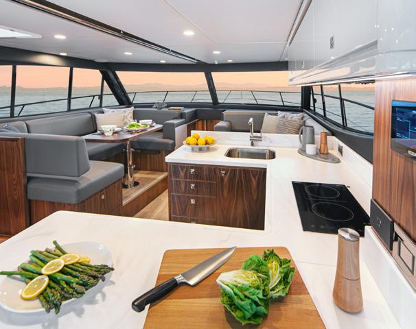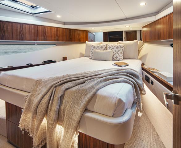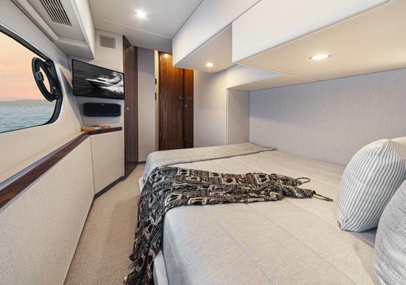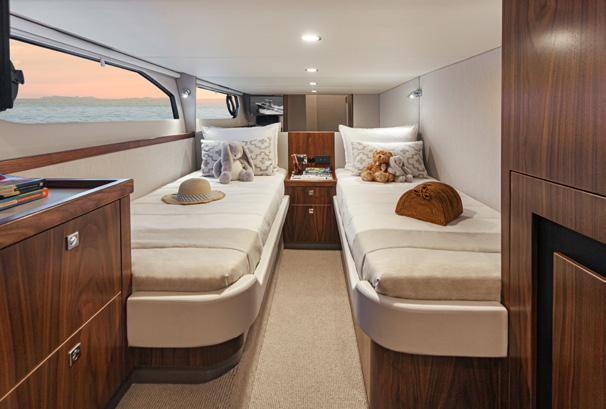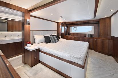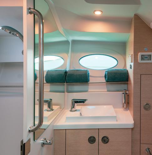 this size. It is an entertainer’s delight with a huge saloon seamlessly opening out to the cockpit through an electric drop-down window and sliding door connecting those enjoying indoor comforts with those outside. Twin helm seats and a large “L” shaped settee on the port side offer plenty of comfort for those wishing to sit down and relax along with a large oak dining table that can be lowered to make another double berth if required. The downstairs spaces are generous and fully air-conditioned offering a full beam owners’ cabin with its own ensuite, and a second full beam guest cabin with a shared bathroom all finished to the highest of standards. LEGACYMARINE.CO.NZ