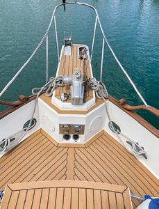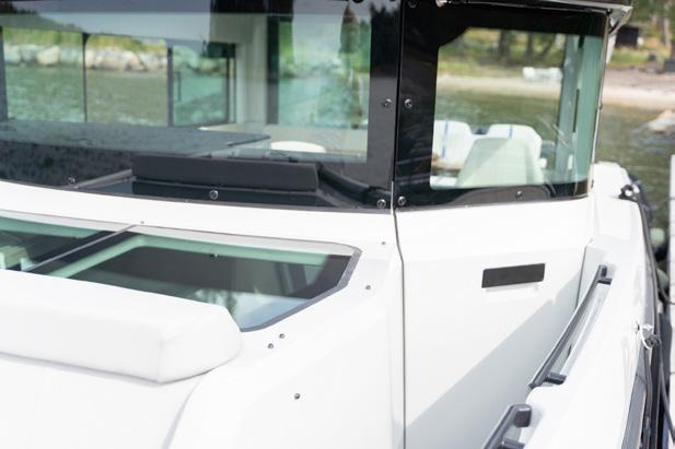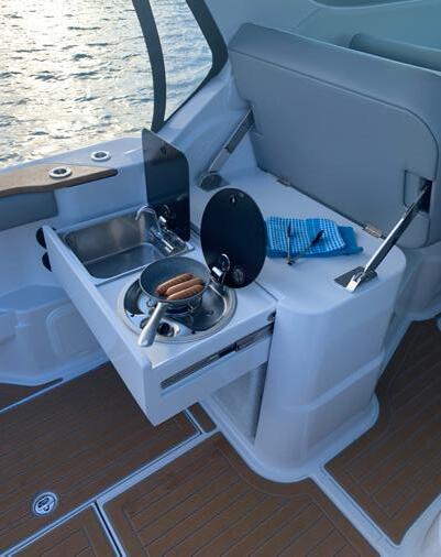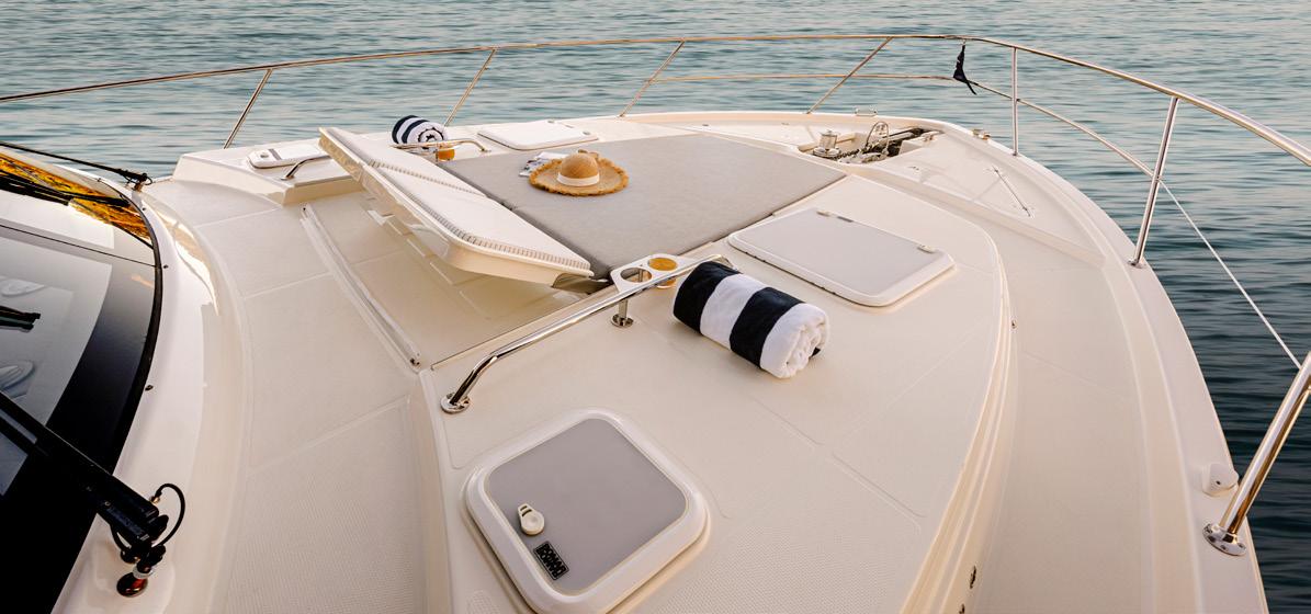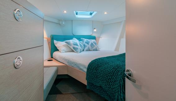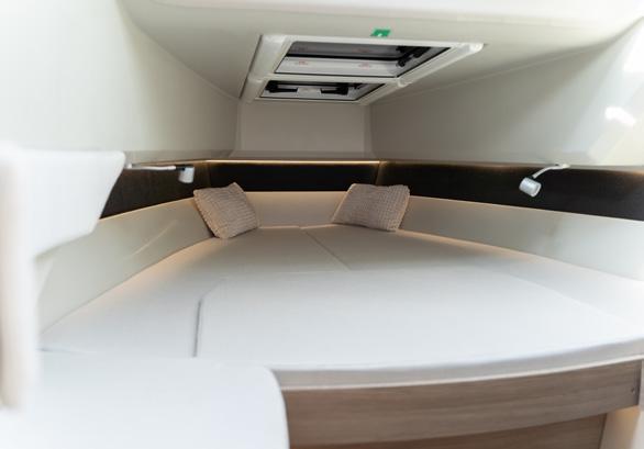 There is a separate anchor locker with flush mounted fairlead, recessed lights and a drop-down cleat on the short foredeck. You will appreciate that small detail when using the foredeck as a boarding platform—no more stubbed toes.