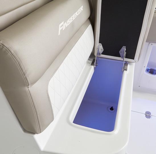 The aft seat hinges up for access to the technical space and extra storage. The Sport 700 has a fold-up table mounted on the helm seat console. Drink holders are plentiful. I was impressed with the diamond-stitched upholstery on all the squabs, internal LED convenience