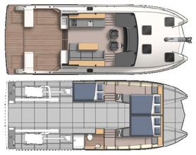 To port is a fridge and BBQ, with copious storage throughout the cockpit. There is a single access to the full-width boarding platform and outdoor shower.