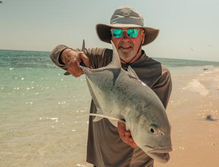 early morning, going first to Bird Islet, which earned its name. The first thing we saw to signal our arrival was a column rising hundreds of meters in the air, thousands of sea birds circling in a thermal draft above the island, as yet only visible by white water breaking on the reef. The birds companions dwelling on the tiny strip of sand and grass below, amongst an untouched reef full of turtles and other life. Driving by the handheld remote at the bow, we slowly navigated amongst the calm, turquoise saturated reef waters and coral bombies, anchoring in a large patch of white sand just offshore. The swirling column of birds continued around us, undisturbed by our presence beyond a mild curiosity. After an English brekkie of poached eggs, bacon, beans and toast, the crew took the tender on a mission to the shore. Equipped with Magnum ice creams, a Voodoo Expedition tradition, for the first steps ashore. The crew embarked on the small circumnavigation of the island, taking in the sights, befriending birds and surf-casting stickbaits into the shallows off the beach. It was an amazing experience standing on the beach surrounded by chattering birds in every direction, bright blue sky with the warm sun blazing, nothing but ocean in the distance and fish and turtles clearly visible at our feet, in the pristine tropical waters. After catching and releasing a couple of hard fighting Giant Trevally we completed our walk around the tiny island, picking up any rubbish and debris found along the way and headed back to the boat. Snorkelling such a remote untouched reef seemed too good to be true, with Mitch and Paris experiencing a particularly amazing interaction with one of the largest female turtles we've ever seen. Whist the younger crew members indulged in pristine reef snorkelling escapades, Daz and Dave took the tender out for a fish around the outer bommies. Due to some radical and unnecessary steering by the skipper, the trolled braid line wrapped around the prop and stalled the outboard. With a strong current and wind rapidly pushing the tender out to the open ocean, quick action was called for. Daz looked back at the quickly shrinking shape of Phoebe while Dave calmly stated “I don’t think they will