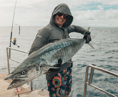 a small reef pass. Simultaneously the boys and the skip (Dave, monitoring triple 16” SIMRAD helm displays) spotted a stack of boomerangs on a bit of structure as the pass opens out to the open sea. A quick shift into reverse to slow Phoebe’s momentum signaled the drop is on. Ben and Daz drop jigs and boom. Suddenly the fish were on, with the first being picked by Ben, a large, extra fat Wahoo which was quickly processed and put on ice. Ben then picked up a perfect eating size coral trout, beautiful in resplendent orange with shining blue spots.