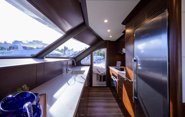 “There are small features that we always work on for performance and the ease of handling. For example, the remote helm station here in the galley,” says Mark as he lifts a section of the countertop to reveal a hidden wing station. “If you look at the visibility from this position, it’s amazing for a boat of this size.”