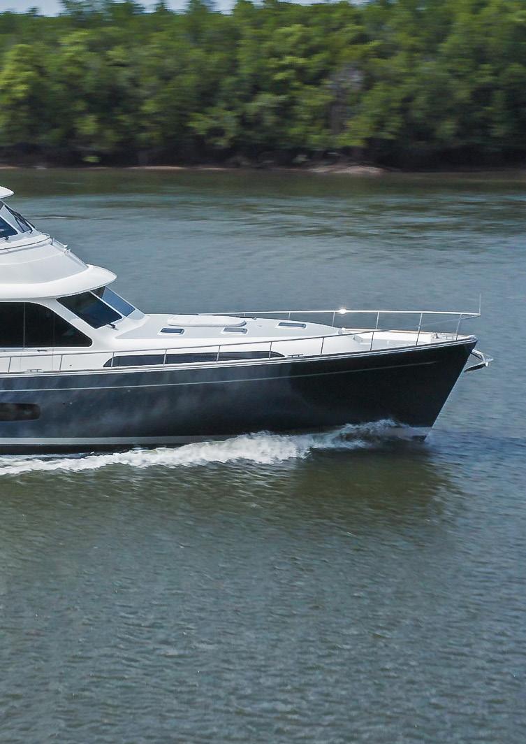 energy and effort. Further evidence of this efficiency lies on the surface of the water, where you will see a flat, clean wake that illustrates how little resistance the boat is encountering. Mark also adds that the ‘soft ride’ that is so characteristic of Grand Banks yachts is in large part due to the construction process. All bulkheads, and even fixed furniture, are fused to the hull and deck. This achieves a semi-monocoque torsion box that is stiff underway and free from any rattles or creaking. All large-mass components are carefully balanced both vertically and longitudinally. The engines and full-beam baffled fuel tank are mounted amidships which ensures a low centre of gravity and creates stability and comfort in all conditions.