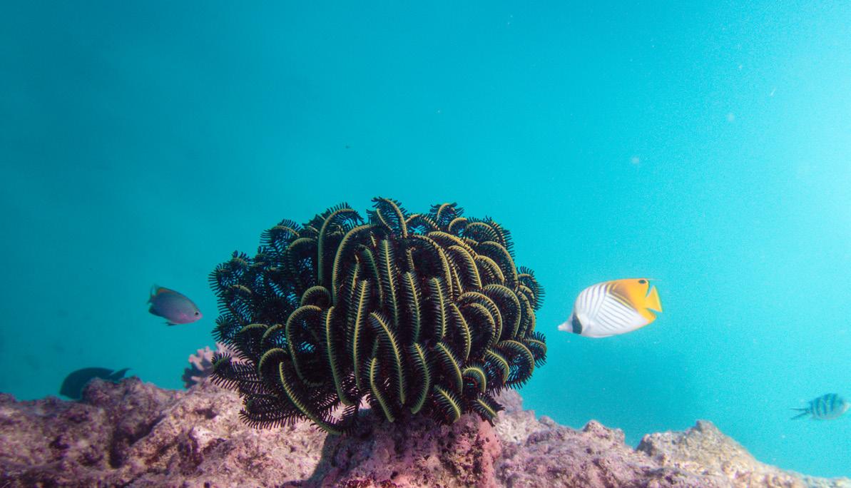 way through a rich maze of coral bombies; driving by remote control from up on the bow Dave found the perfect anchorage for a snorkel. The abundance of life in amongst the sanctuary otherworldly looking corals was stunning. Tropical fish and white tip reef sharks populated the oceanic jungle and some crew were in the water for a good couple hours, enjoying the beauty of the reef environment.