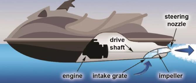 All PWC’s operate on the basic principle seen here, with a water jet compressing the intake water and shooting it out through the aft nozzle providing both propulsion and steering.