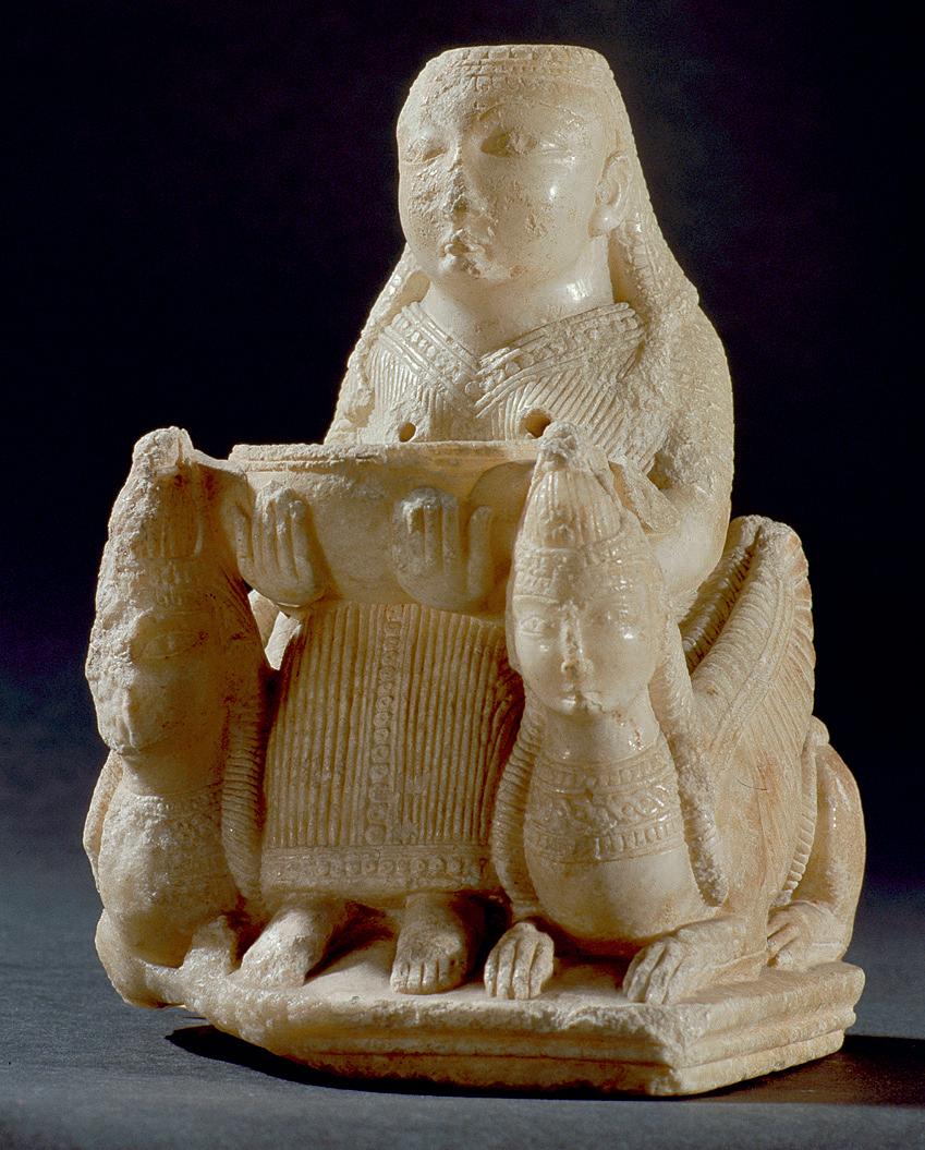 Tra il IX e l’VIII secolo a.C. i Fenici solcarono le acque del Mediterraneo raggiungendone i punti più estremi: la Sicilia e la Sardegna, le coste nord-occidentali dell’Africa, la Penisola iberica. Dalla città di Galera (nella provincia di Granada) proviene per esempio questa statuetta in alabastro che rappresenta una dea seduta su un trono (forse Astarte), con un bacile tra le mani, affiancata da due sfingi alate: si doveva trattare di una statuetta impiegata in qualche rituale che prevedeva abluzioni. Risale all’inizio dell’VIII secolo a.C.