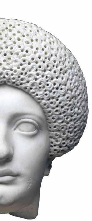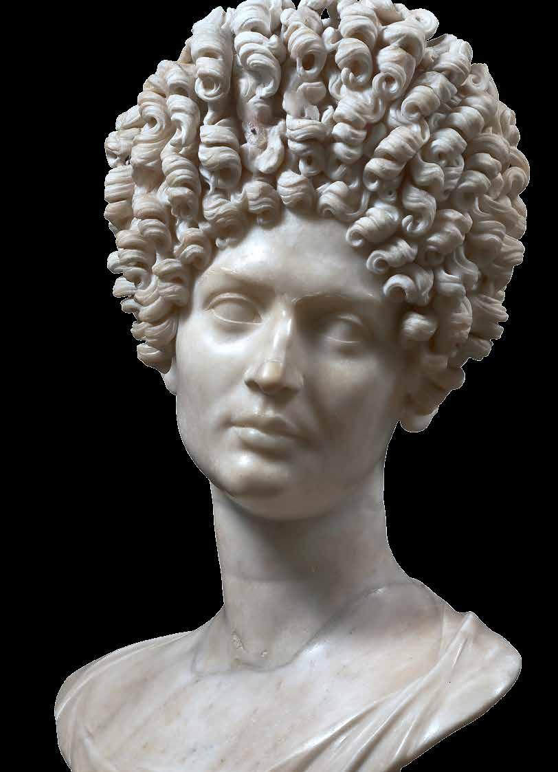 DAMA DI CORTE Ritratto femminile è il busto di una donna della famiglia imperiale o di un’aristocratica dell’Urbe. Lo si capisce dalla raffinata acconciatura: alta corona di boccoli e sulla nuca una crocchia di trecce.