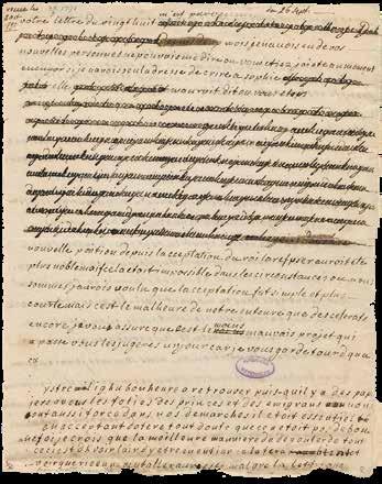 Dettaglio di una lettera scritta da Maria Antonietta a Fersen il 4 gennaio 1792. La frase cancellata e riquadrata in rosso nasconde una dichiarazione d’amore: “non pas sans vous” (“non senza di voi”).