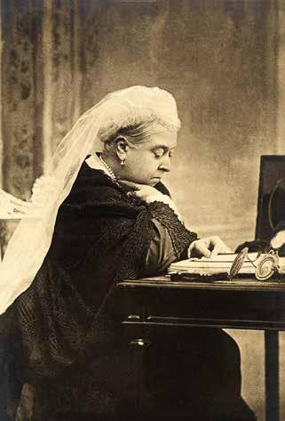 A destra, ritratto di una giovanissima Vittoria nel 1838 (ascesa al trono da appena un anno) del pittore britannico Thomas Sully. Nell’altra pagina, la regina anziana, alla sua scrivania, in una fotografia di fine dell’Ottocento.