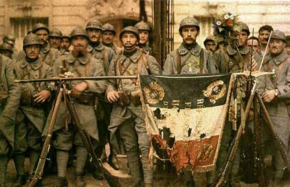 La Libertà che guida il popolo di Eugène Delacroix (1830), al Louvre di Parigi. Nell’altra pagina, soldati francesi con la bandiera, durante la Prima guerra mondiale, nel 1917.