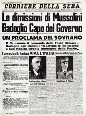 A destra, il Corriere della Sera annuncia le dimissioni di Mussolini e il nuovo capo del governo (26 Luglio 1943).