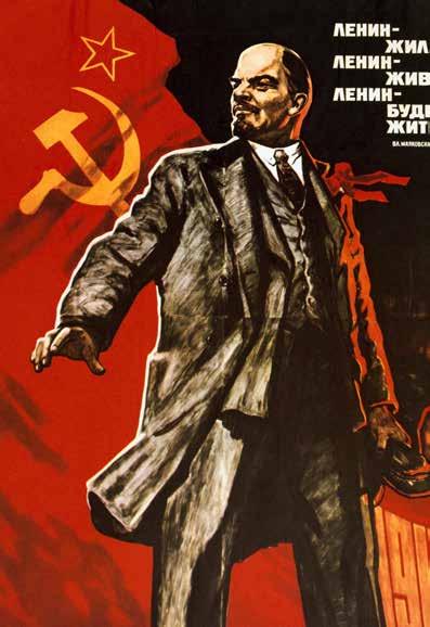 Un poster del 1965 che recita: Lenin è vissuto, Lenin vive, Lenin vivrà. In alto, illustrazione della Comune di Parigi.