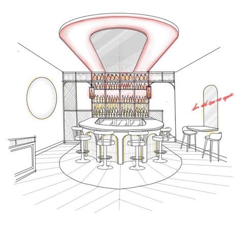 The design for the bar involved the creation of a free-standing turbine-inspired, metallic sculptural centrepiece, paying tribute to the character and form of Battersea Power Station’s electric, industrial history. An illuminated radial metal canopy with fixtures by Arc LED adorned with delicately perforated metal fins encircles an existing central column, lending a sense of energy, movement and permeability.
