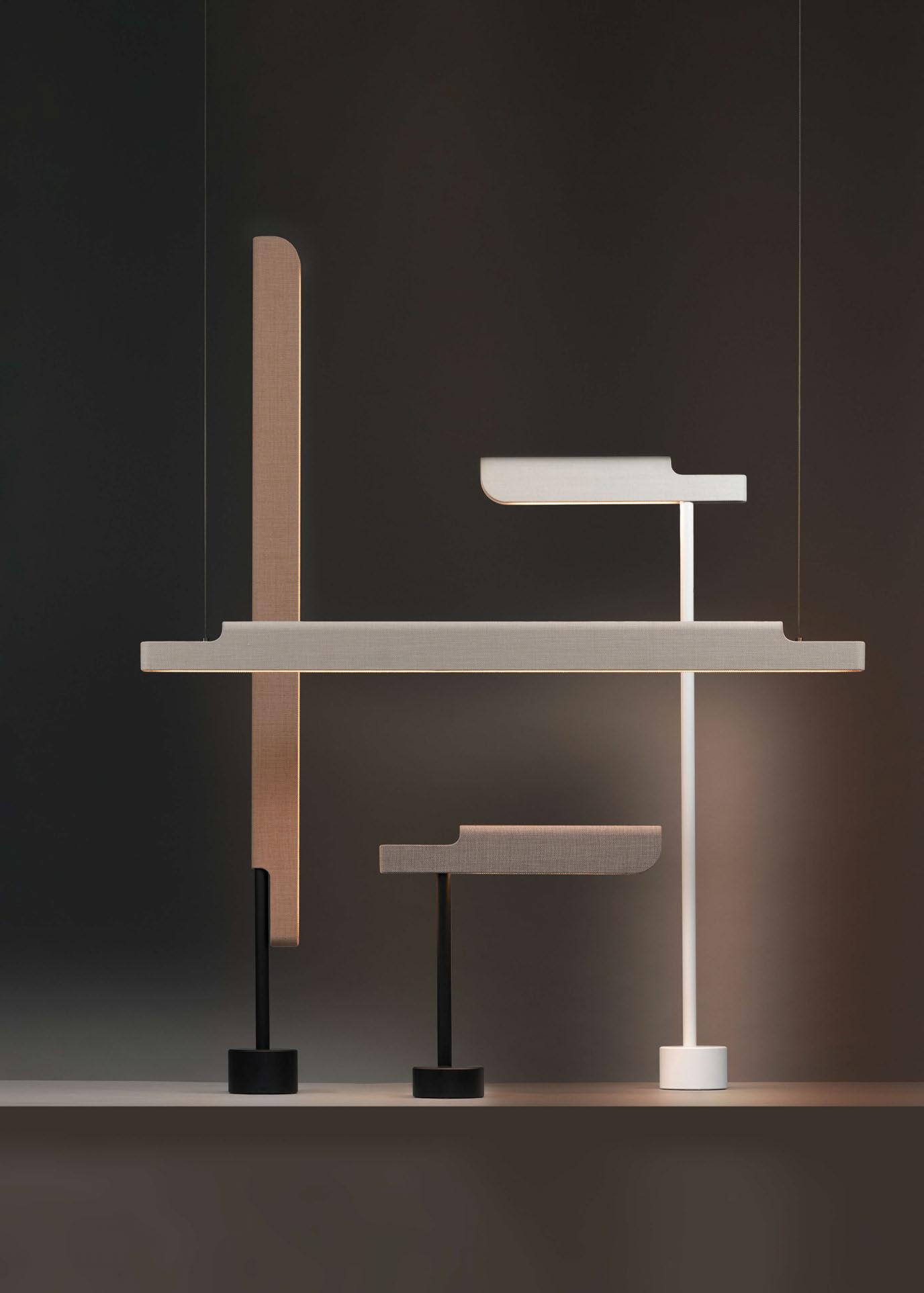 The collection expands into a vivid, nuanced balance between improvisation and structure, control and intuition. The Compass family has a vision of formal delicacy, whose almost imperceptible structure could generate flexible geometries tensioned by the small spheres of light that make up the main visual body of the ensemble. Three is an interplay of weights and gravitational movement of the elements, and can also change its geometry and functionality.