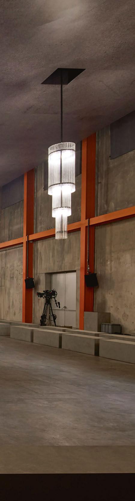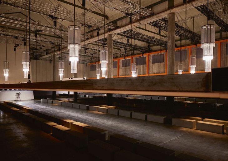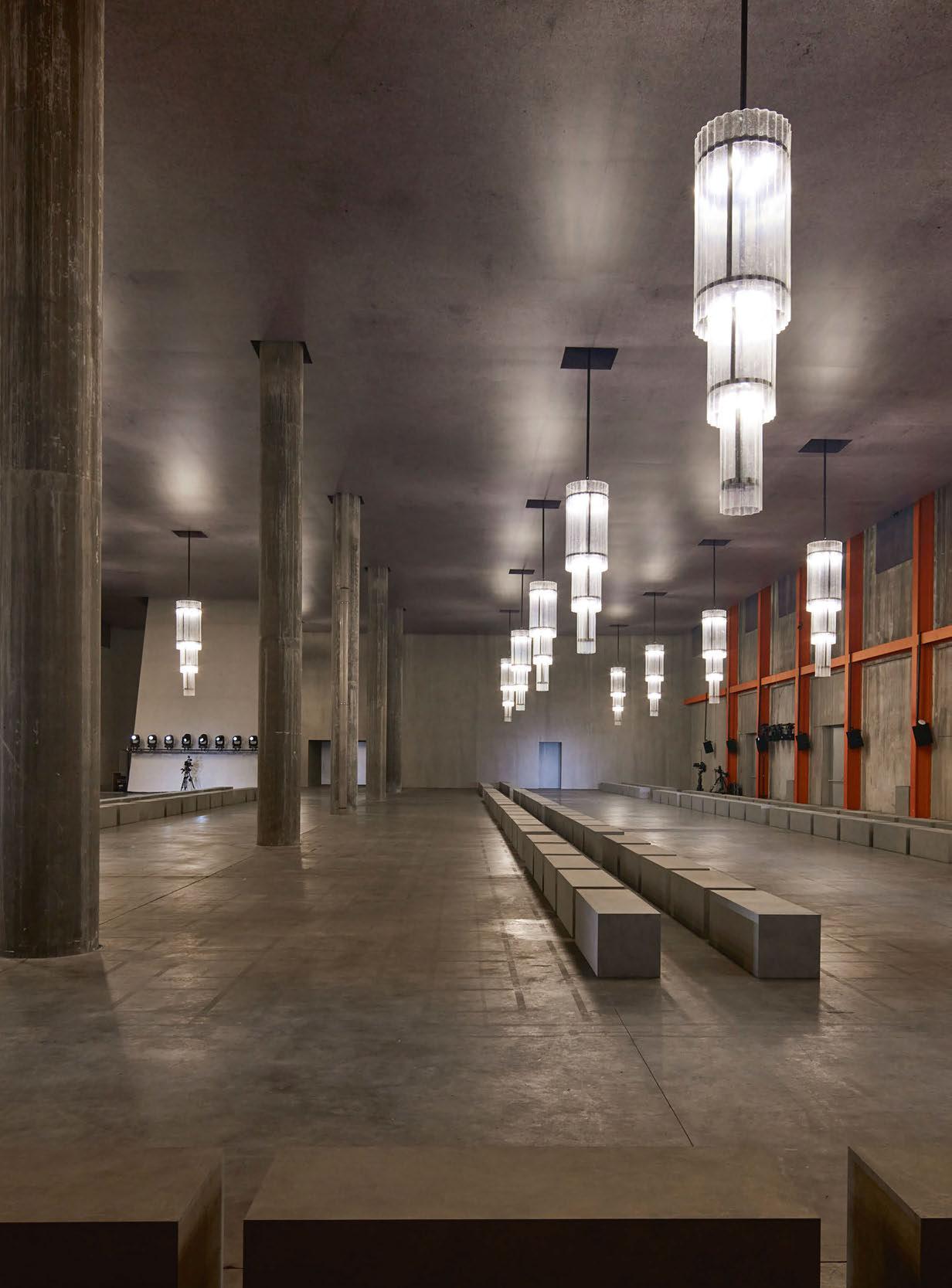 For the lighting of the show, AMO designed a handcrafted in-house installation of 20 ceilingsuspended chandeliers. Conceived as an industrial style reinvention of the classic chandelier shape, the three-tiered pieces are made of a three-metre-long and 90cm-wide black iron structure with a translucent ribbed fiberglass envelope that gently filters the light. Each of the three levels includes a group of four R7s - 400W halogen lamps with independent on/ off switches, allowing the gradual illumination of the Deposito space at Fondazione Prada.
