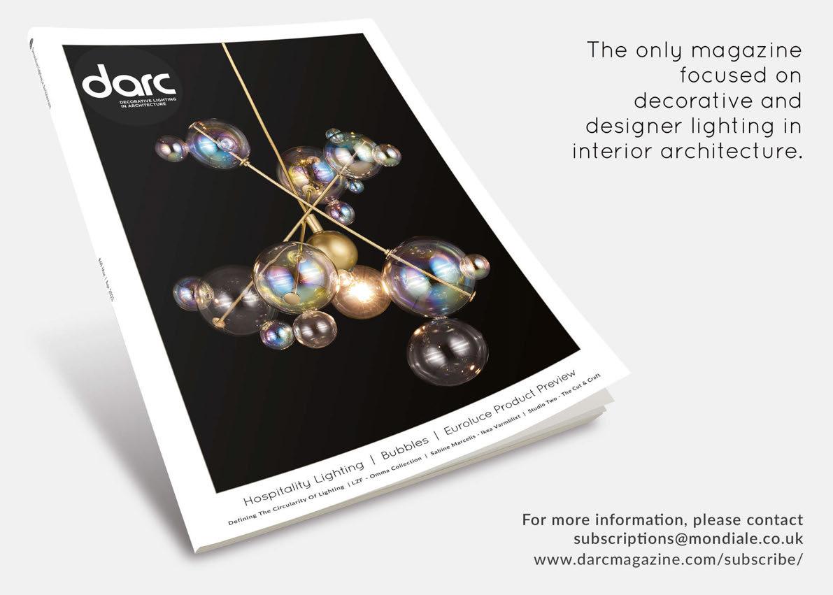 On the cover, we are featuring the beautiful Bubbles pendant from Brand Van Egmond. Designed by William Brand, this new handmade collection was inspired by children playing with bubbles and the mesmerising colours and forms bubbles take on. The new collection will be on show at Euroluce in Hall 9, Stand 205.