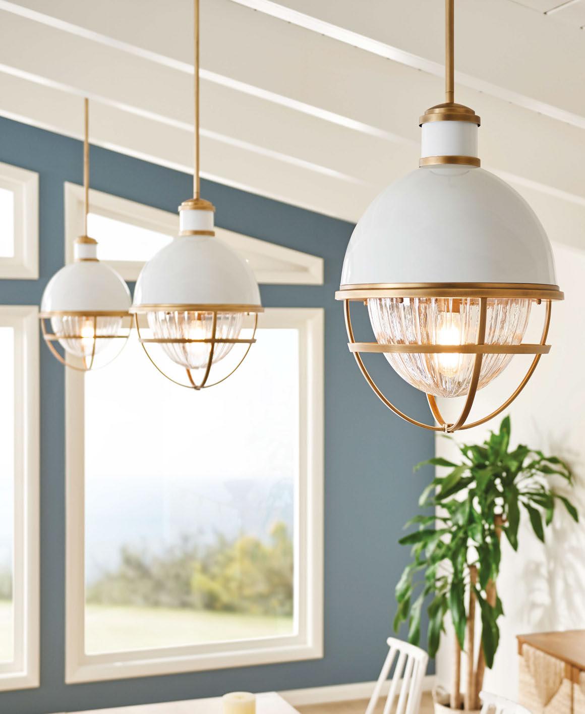 The Quintiesse collection has 200 new unique and memorable designs, including the Linara range. The natural brass finish contrasts with the matte black metal slatted shade. When illuminated, this range adds an intangible texture to the surrounding canvas. The Linara range consists of the featured six-light round pendant chandelier, a five-light linear chandelier, a tall single pendant, and large wall light.