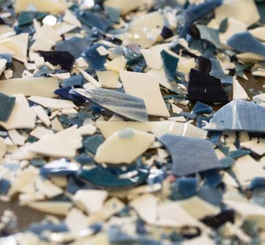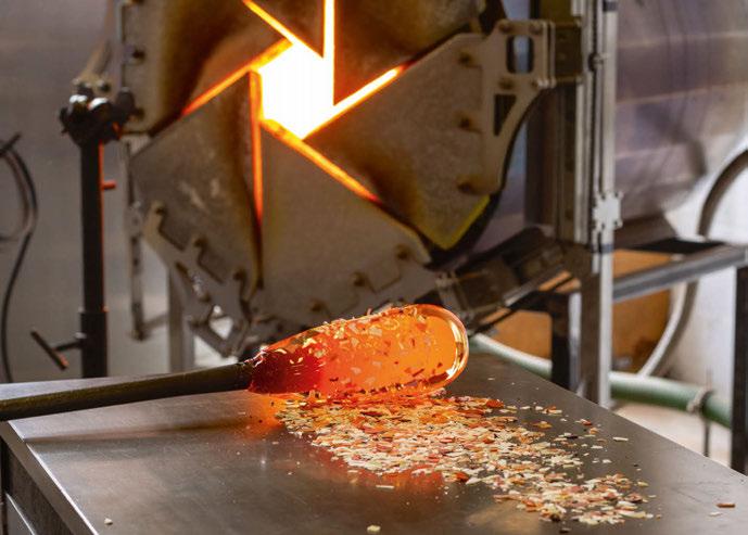 “The glass shards need to be graded into size and then mixed to the right consistency, making sure the composition of colours is correct throughout the form. They are then heated up on a metal marvel and molten glass is rolled into them. Once there is an even coverage the glass is then melted in using a re-heating chamber and shaped.”