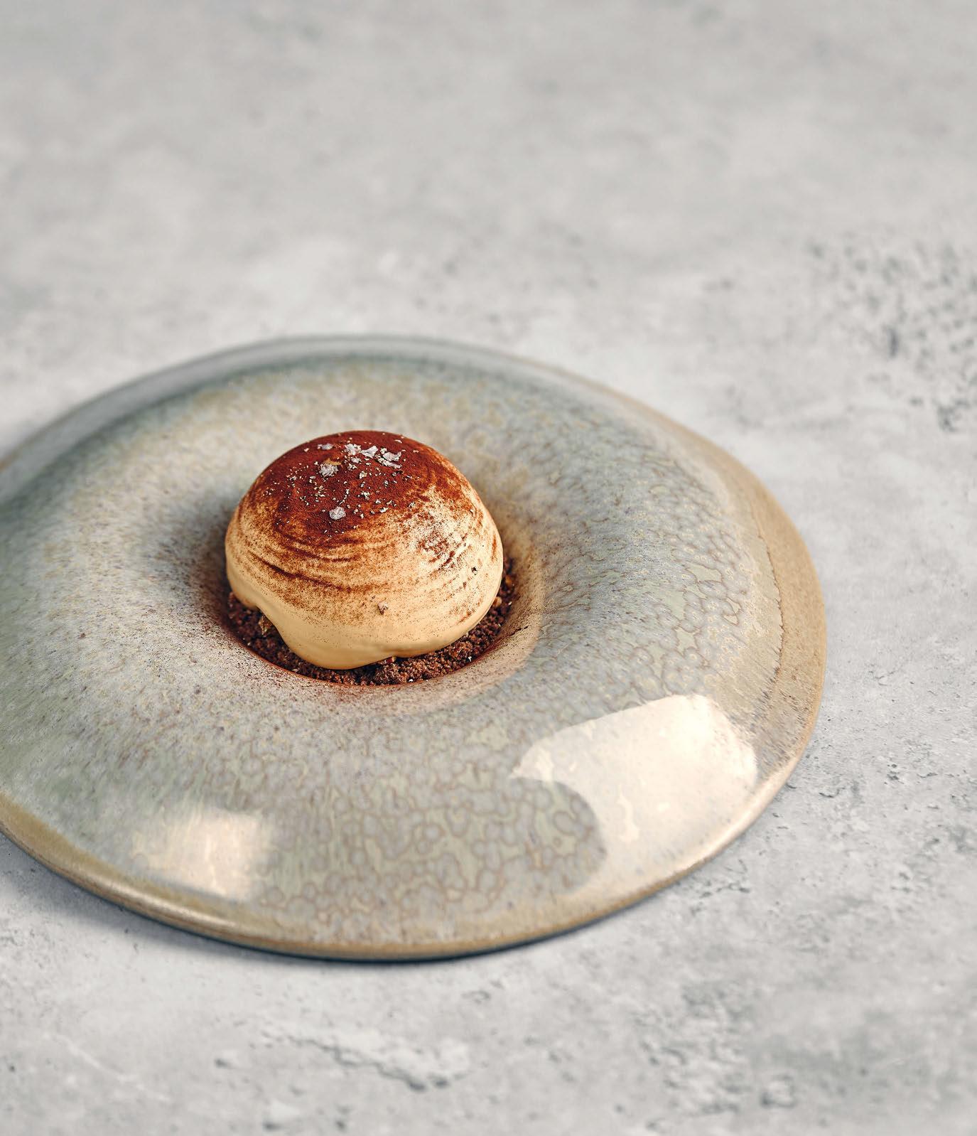 Coffee often plays a starring role in Herzig’s cuisine, including on the new autumn menu, featuring a melanzani panisse served with carrot and a coffee blanc – a classic beurre blanc infused with coffee beans that adds a subtle, bitter note to the sauce. “I believe coffee always needs a counterpart, usually acidity, often fruity acidity,” Herzig explains. “That balance, bitter notes paired with a lively, fruity acidity, creates harmony.”