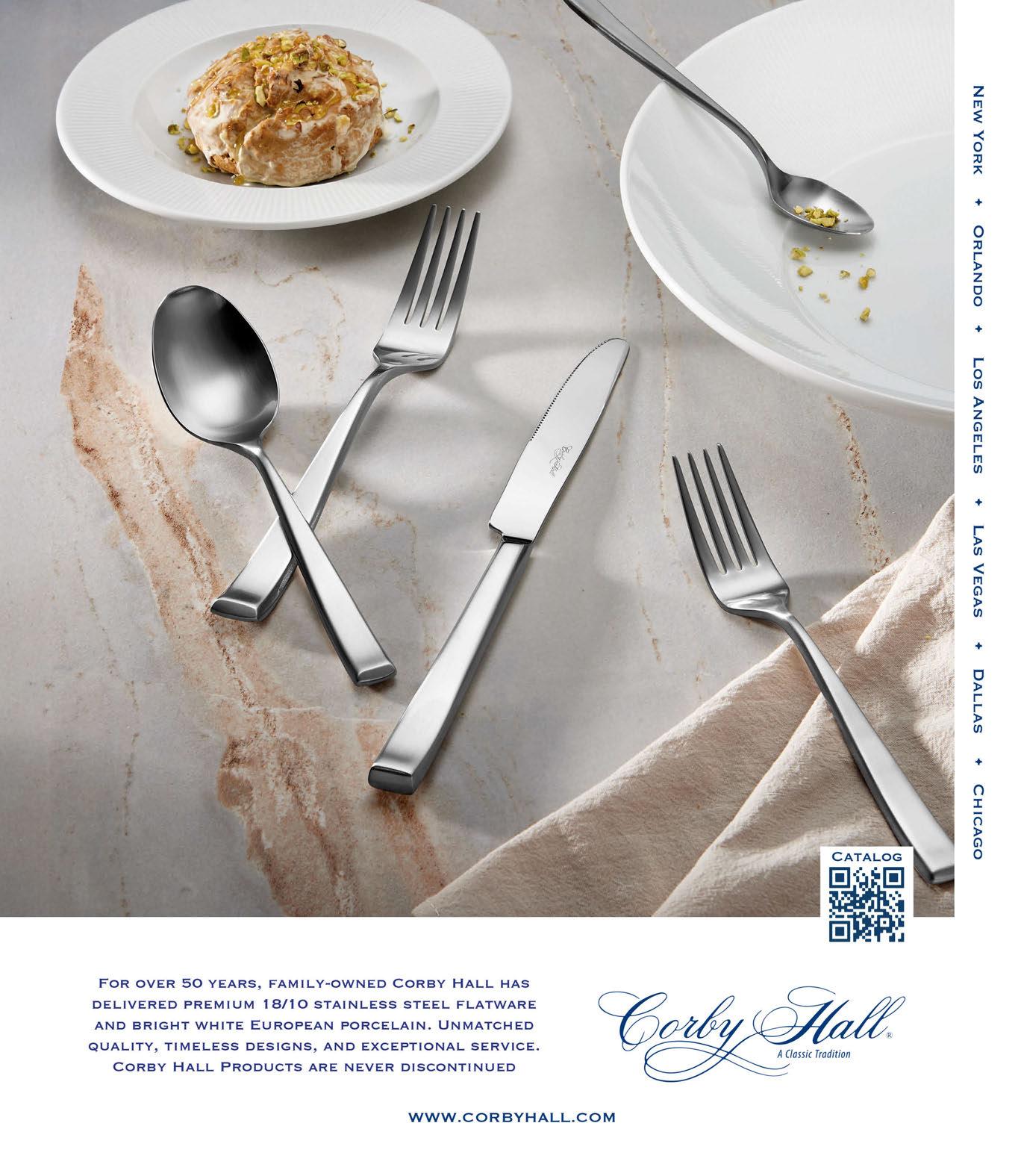 A family-owned business based in Randolph, New Jersey, Corby Hall has supplied the international hospitality industry with high-quality flatware, holloware and bright white porcelain dinnerware for the past 50 years. With designs ranging from traditional to contemporary, at competitive price points, Corby Hall has the ability to supply F&B outlets associated with a full-service operation. A global distribution network coupled with production facilities in Europe and Asia allows for seamless service for both opening orders and resupply. The Oslo Satin flatware collection includes 17 pieces, made from 18/10 forged stainless steel in a satin finish. www.corbyhall.com