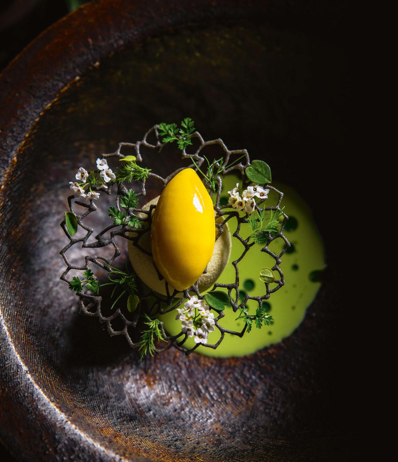 Expect the inside scoop on inventive compositions like honey walnut cake with Colston Bassett Blue cheese, or the Hen of the Woods Lollipop glazed with meadowsweet caramel. There are also playful pairings like crumpets and lardo, scampi topped with seaweed, and the visually striking Kitchen Garden, complete with edible broccoli soil.