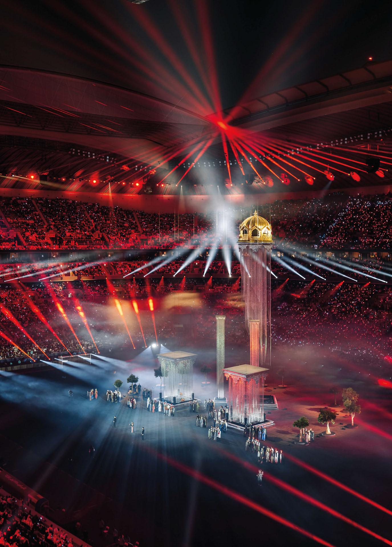 Arabian architecture-inspired kinetic structures take centre stage in a visually ambitious and creatively rich opening ceremony at Al Bayt Stadium.