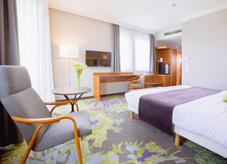 Zimmer: Die 196 eleganten Zimmer (18–28m²) verfügen über ein Badezimmer mit Badewanne oder Dusche/WC, Föhn, Leihbademantel, Klimaanlage, LCD-Kabel-TV, Safe, Minibar und WLAN sowie teilweise Balkon.