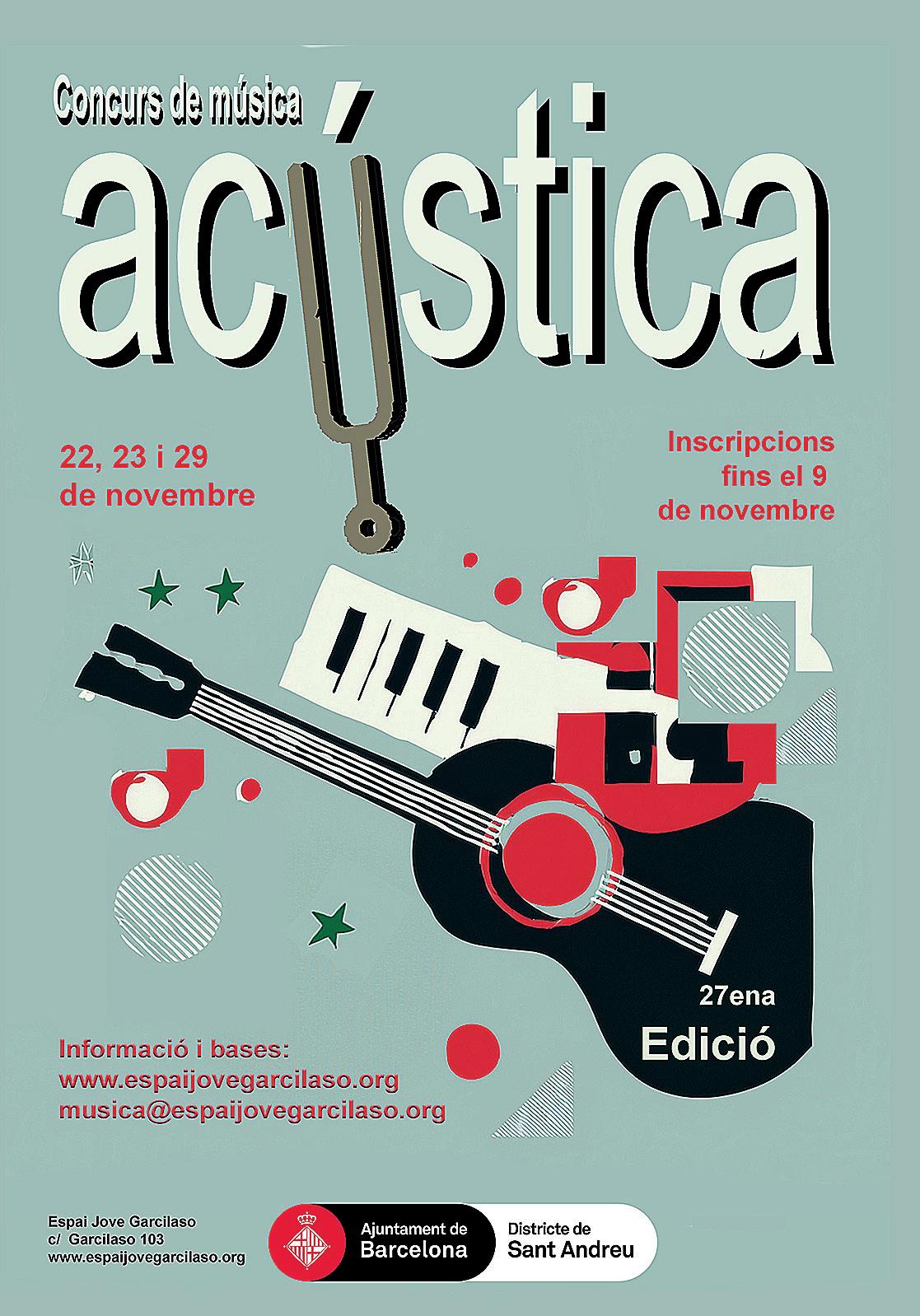 JA ET POTS INSCRIURE a la 27ena edició del Concurs de Música Acústica. Com sempre, les semifinals es duran a terme al llarg dels dies 22, 23 i 29 de novembre a l’Espai Jove Garcilaso del districte de Sant Andreu, a Barcelona. El concurs –al que et pots inscriure fins al 9 de novembre– està obert a tota mena d’estils musicals (flamenc, pop, rock, mestissatge, contemporània, jazz...), posant èmfasi a la sonoritat acústica dels instruments musicals. Pel concurs han passat artistes com La Ludwig Band, Jo Net i Maria Ribot, Jester, Canciones de Nadie, Elle León i molts altres. MS www.espaijovegarcilaso.org