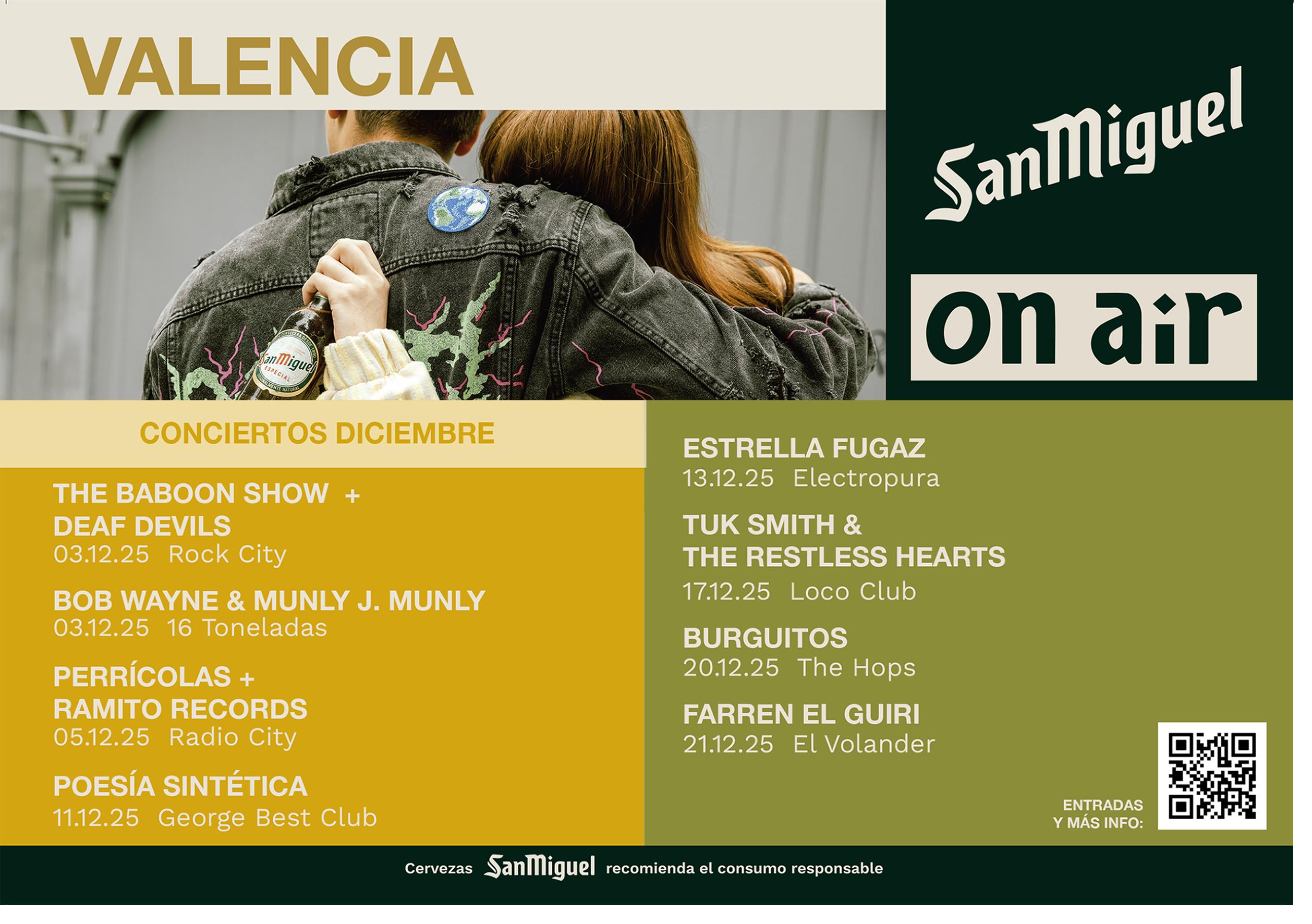 ción continuará con el folclore y la electrónica de Estrella Fugaz el sábado 13 en Electropura, y el miércoles 17 con el rock del americano Tuk Smith & The Restless Hearts en el Loco Club. El ciclo se acerca al final con el gran Burguitos y su repertorio sarcástico gamberro en The Hops el sábado 20 y se despedirá el domingo 21 en El Volander con las canciones tragicómicas de lo cotidiano de Farren El Guiri, punto final de esta edición de San Miguel On Air en València. MS