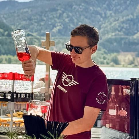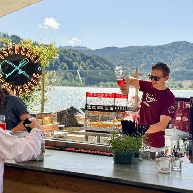 Wer im Sommer aktiv sein will, kann sich beim Seppi stunden- oder tageweise ein SUP ausleihen und auf dem magisch grünen Wasser gleiten oder sich von der nahen Anlegestelle mit der Schliersee Schifffahrt eine Runde um den See schippern lassen, und sich anschließend mit der hauseigenen Kreation, Seppis Seebar Spritz belohnen. Die Rezeptur dafür gibt's erst am Ende des Artikels. Überhaupt, „der Spritz is mei Signitscha, a bisserl bitter, a bisserl herb, a bisserl fruchtig", sagt der Seppi und kann mit ungefähr 30 verschiedenen Kreationen des beliebten Cocktails aufwarten. Auf der Karte findet der Gast aber auch sonst alles, was das Herz an so einem lässigen Tag am See begehrt, hervorragende Südtiroler Weine, Champagner, diverse Gin Varianten, erlesene Spiritousen u.v.m. Unterstützung bekommt der Junggastronom von Mama Petra, die hilft „wenn’s brennt“ und schaut, dass es den Gästen gutgeht. „Das wichtigste für mich ist, dass die Gäste sich in meiner lässigen Bar wohlfühlen und gerne wiederkommen.“ Das beweisen die vielen Stammgäste, die Seppi schon seit Anfang an die Treue halten.