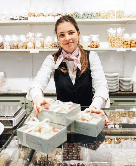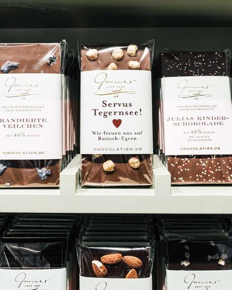 Mit der Eröffnung ihrer zwölften Filiale ist die Confiserie Gmeiner mit ihren Standorten in Süddeutschland und Japan nun auch im Herzen von Rottach vertreten. Wie etwa in München, Freiburg oder Baden-Baden ist das Ladengeschäft auch hier geprägt von viel Licht, freundlichen Farben und einem klassisch-französisch anmutenden Charme. Auf der zartgrünen Holztheke liegen verführerisch bunte Macarons und edle Pralinen neben liebevoll deko rierten Törtchen und Kuchen sowie süßen und herzhaften Leckerbissen. In den Regalen verlocken Schokoladen, Florentiner, Orangenstäbchen und andere Spezialitäten zum Zugreifen. Die Köstlichkeiten, die hier in zartrosa Kartons verpackt über die Theke gehen, sehen nicht nur hinreißend aus, sie schmecken auch himmlisch!