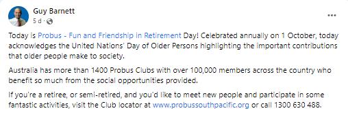 Probus Clubs across Australia and the world perform an important role in strengthening social connections for semi-retired and retired people, allowing them to come together and experience a wide variety of activities while making new friends and spending time with old ones. - Rebecca White- Labor Member for Lyons