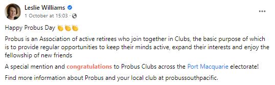 “Probus is an Association together in Clubs, the basic to provide regular opportunities active, expand their interests fellowship of new friends.” Member for Port Macquarie