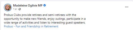 The Probus clubs in my electorate, and across Australia, are immensely valuable to their members and the wider community. Retired and semi-retired people across Clark come together and make new friends within the local communities at Probus Clubs. - Ella Haddad - Labor Member for Clark