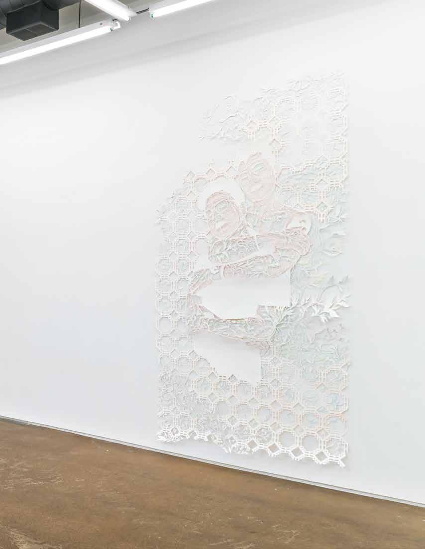 AB: I start by sketching out the body, contour drawing, responding with the backgrounds, and adding ele-ments, vessels, picture frames, or other external elements. Often, I already know certain elements I want to include; one is always reacting to one another. Sometimes I project an image of a vessel, sometimes I use preexisting cut pieces, and I trace them on. Then the patterns will overlay certain bodies, and as I cut them, I decide where to highlight certain elements more and when to overlap them. I am really interested in slippage and allowing boundaries to melt into each other. It’s a very intensive drawing process, yet in the final image all that remains of that process is the faint glow of the color pencil on the verso, reflected onto the wall.