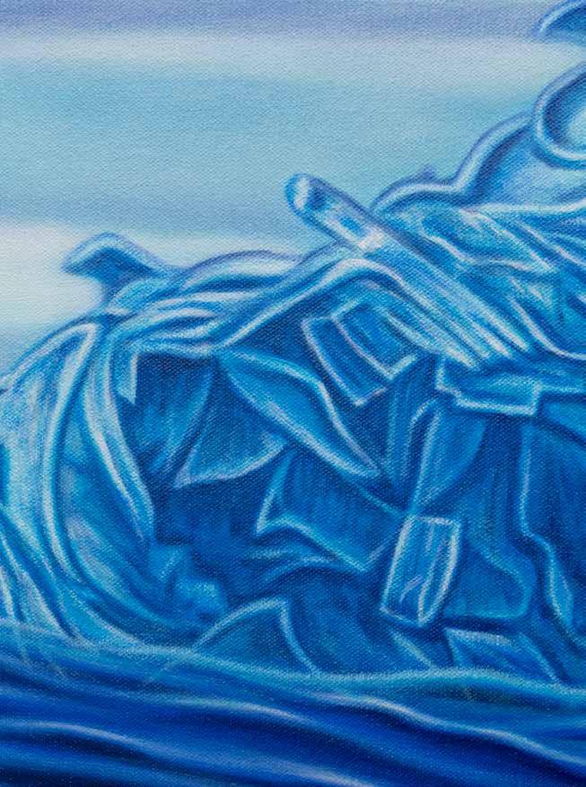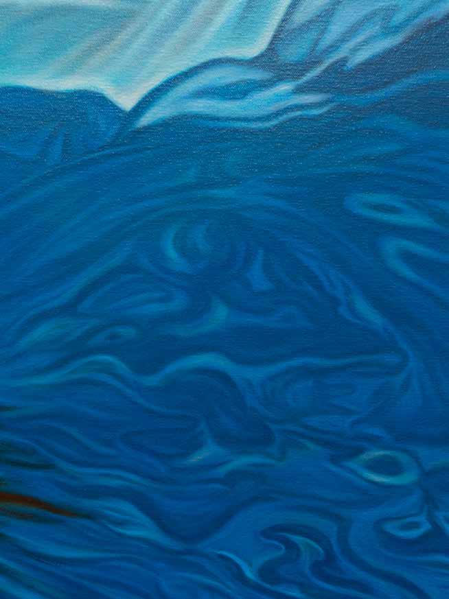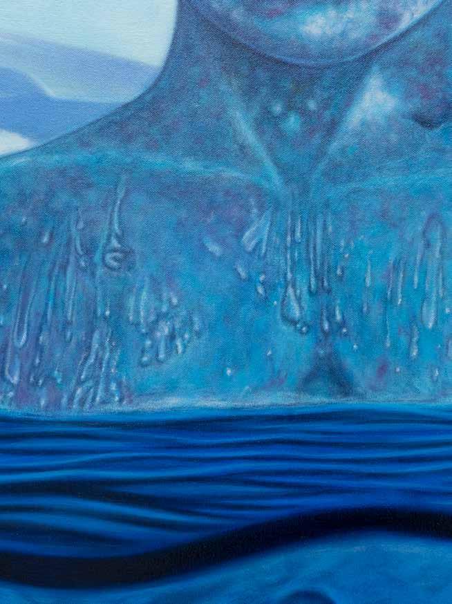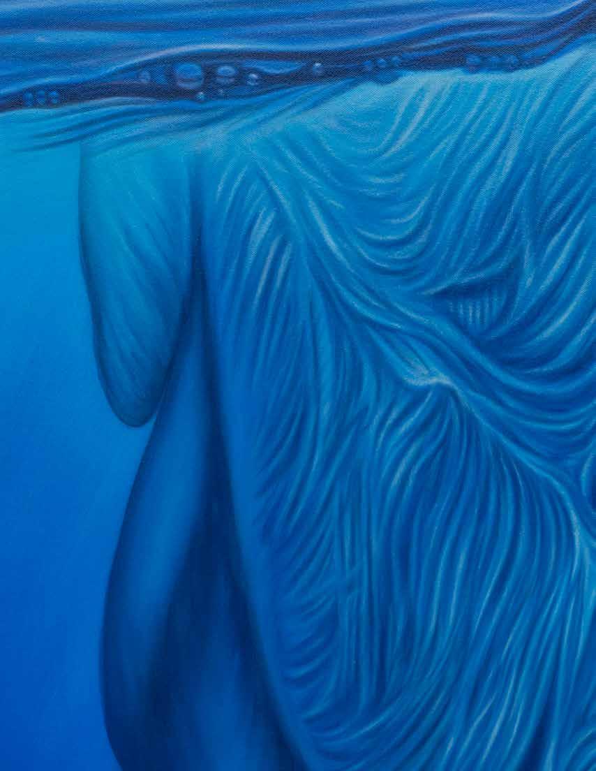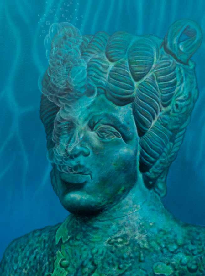 notion that each being is sentient. Exposed to the elements, salt water has oxidized a patina, creating a pallet of turquoise and violet hues of skin tones. Thicker applications of oil paint capture the rough materiality of each figure’s body created by exposure to salty erosion, while multiple layers of thin, transparent oil paint allow the illusion of ethereal underwater atmospheric effects, lending to a believable sense of dimensionality within each picture.