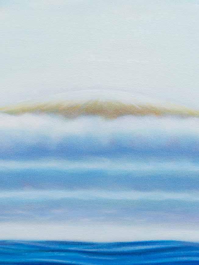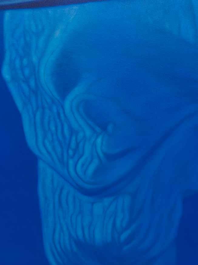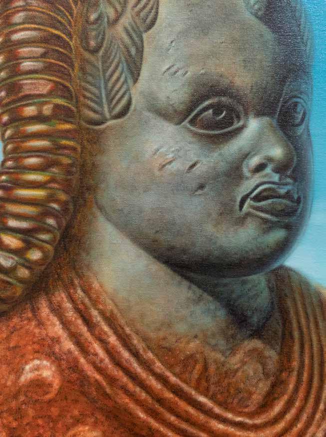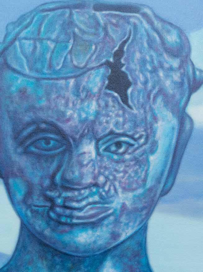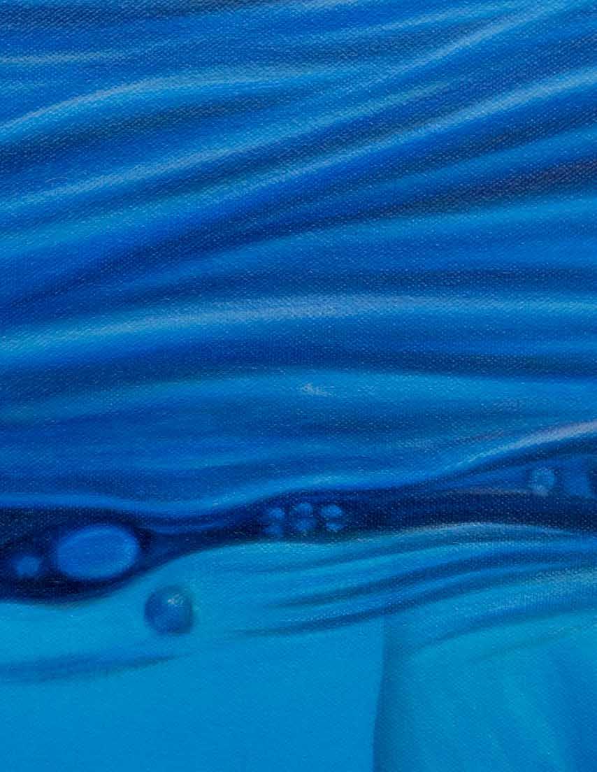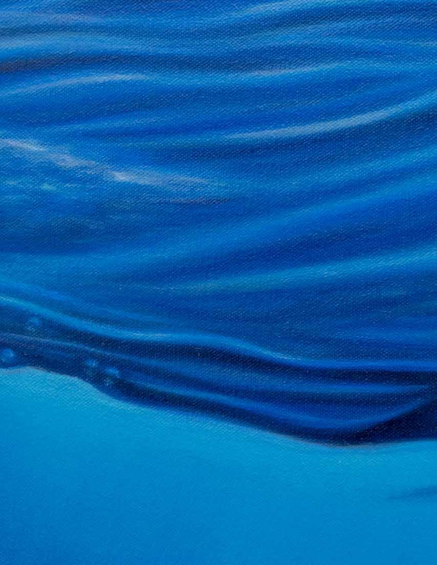 notion that each being is sentient. Exposed to the elements, salt water has oxidized a patina, creating a pallet of turquoise and violet hues of skin tones. Thicker applications of oil paint capture the rough materiality of each figure’s body created by exposure to salty erosion, while multiple layers of thin, transparent oil paint allow the illusion of ethereal underwater atmospheric effects, lending to a believable sense of dimensionality within each picture.