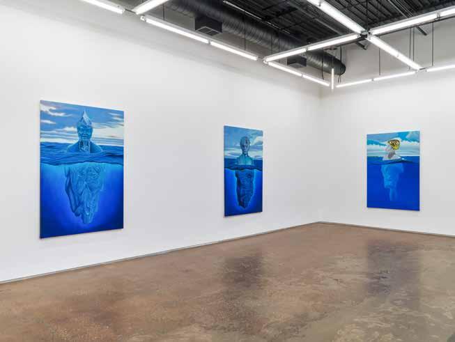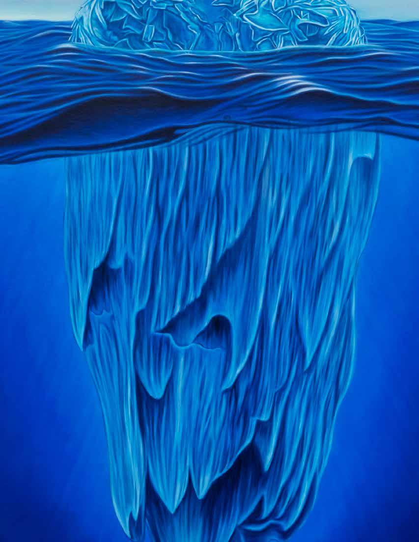 Isolated in deep water, as if a glacial island unto themselves, we are confronted with four large scale paintings depicting Iceberg Entities. Artifacts meld into thawing bodies that culminate into half man, half iceberg. Frozen, crackling ice and glacial peaks form around the heads and torso of each figure while the lower body descends into the abyss. I refer to this as “Iceberg History,” rendering visible waterlines to serve as a metaphor for temporal demarcation; separating the visible from the invisible world emphasizing water’s ability to obscure, conceal, or reveal what was once beneath.