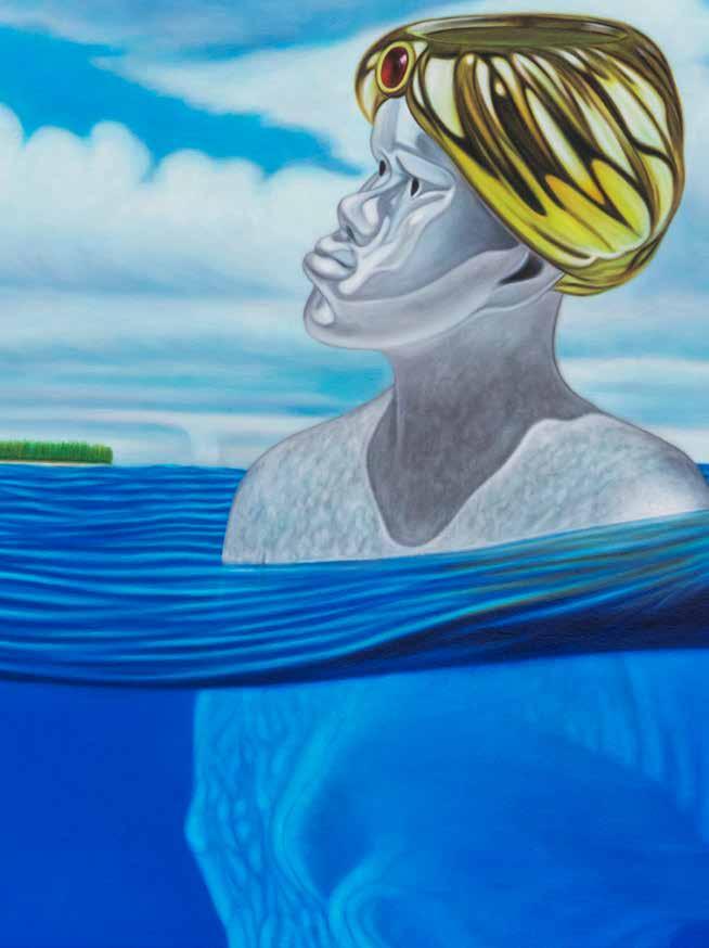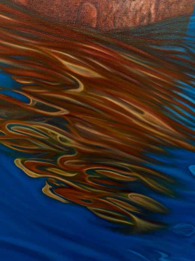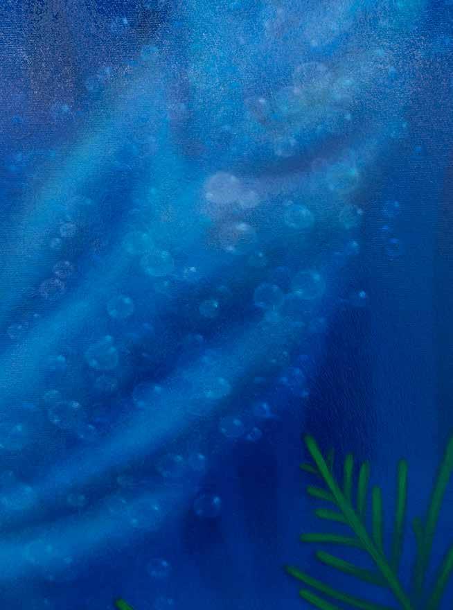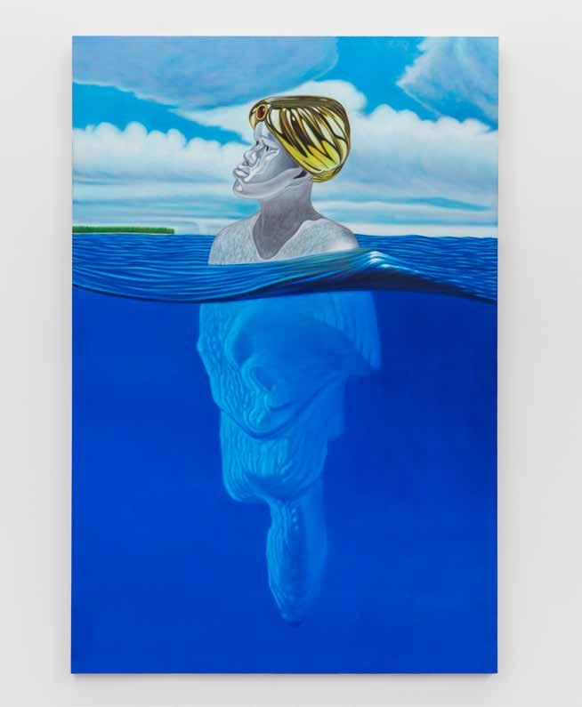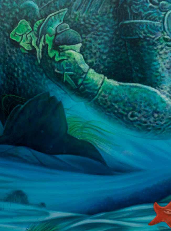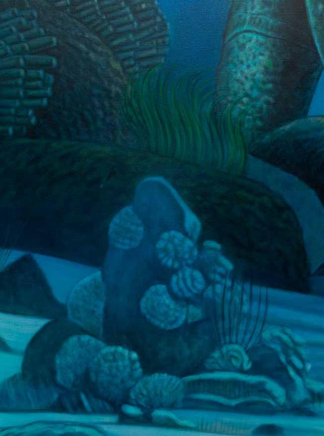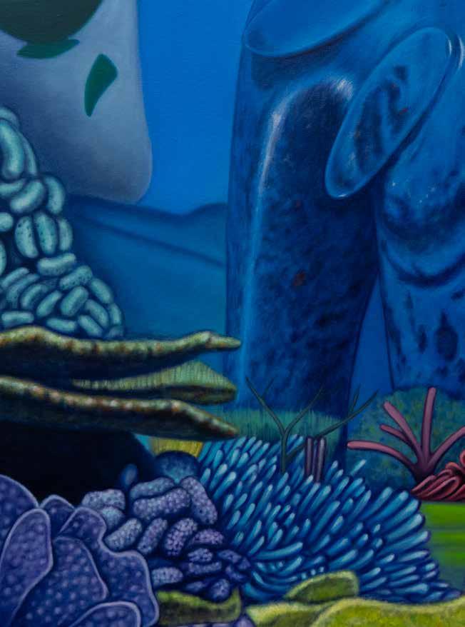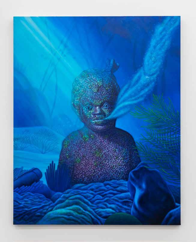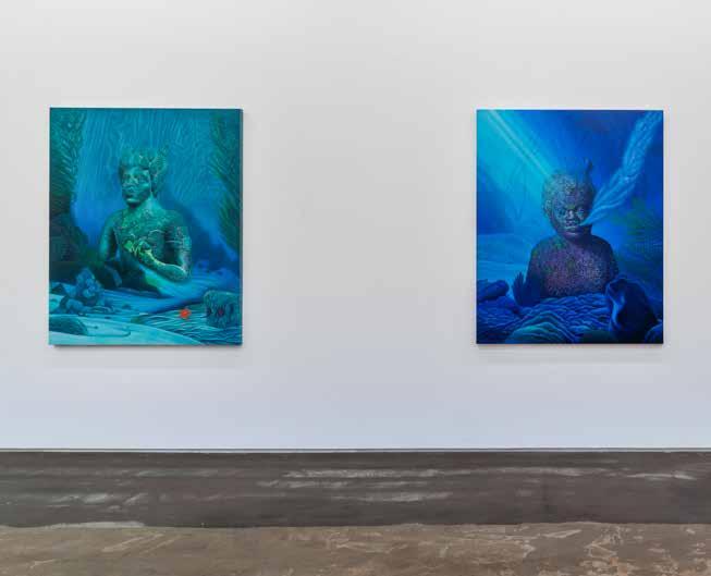 ocean floor. These deep-sea habitants occupy underwater terrains surrounded by coral reefs, swaying kelp, and rocky escarpments, patinaed and eroded by the effects of longterm submersion, skin tones rendered through thicker applications of turquoise, green, and violet oil paint. Who these subjects are, how they got here, or where they were going remains to be seen, yet the depth at which they exist suggests a connection to the relationship we have with our oceans and how little we understand of these undiscovered worlds. The ocean, emblematic of our universe with its depths equally as pitch black and silent as the cosmos, is a carrier for hidden histories.